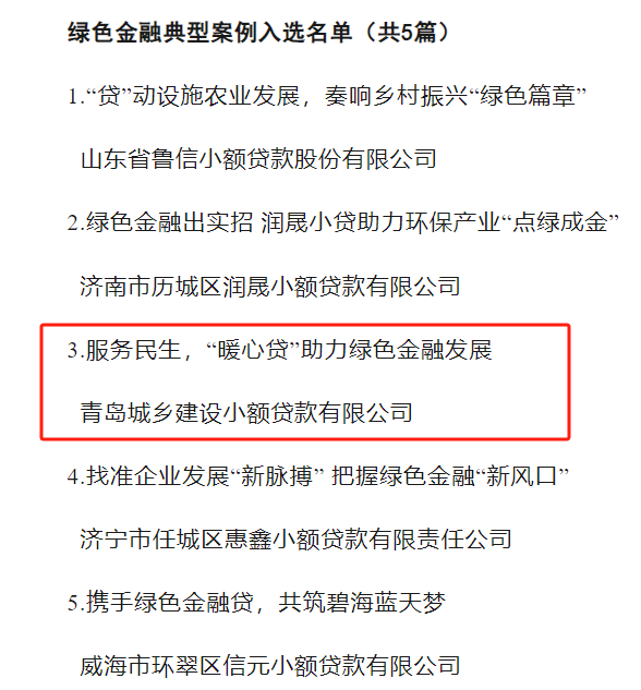 近期,山东省小额贷款企业协会发布《做好“五篇金融文章”助力地方发展案例榜单》,青岛城投城金集团旗下城乡小贷公司暖心贷、产融e贷两项业务分别入选绿色金融典型案例、数字金融典型案例。