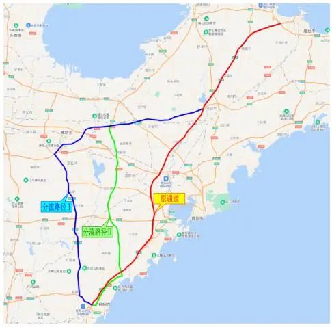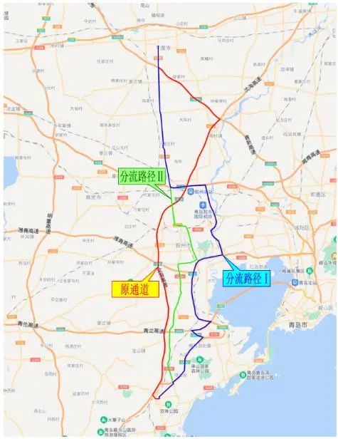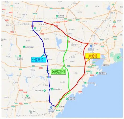 潍坊-青岛分流路径。利用青银高速、潍青高速、潍日高速、青兰高速作为潍坊至青岛的分流路径。