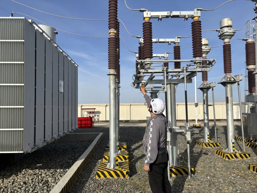 (图为新疆木垒光伏电站工作人员对高压侧线路测温)