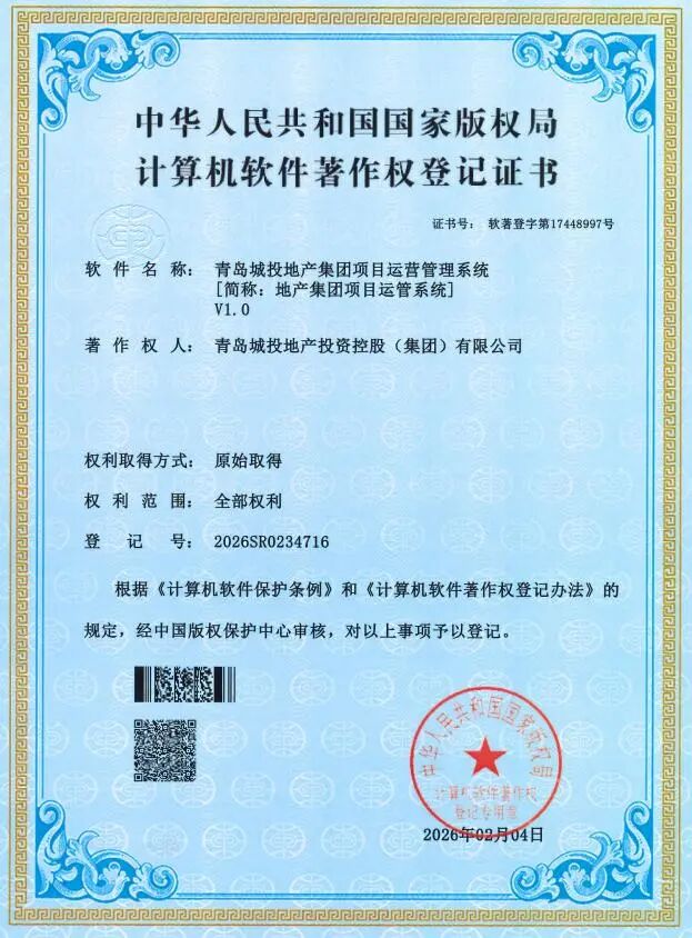 青岛城投地产集团首个自主研发的项目运营管理系统获国家软件著作权认证
