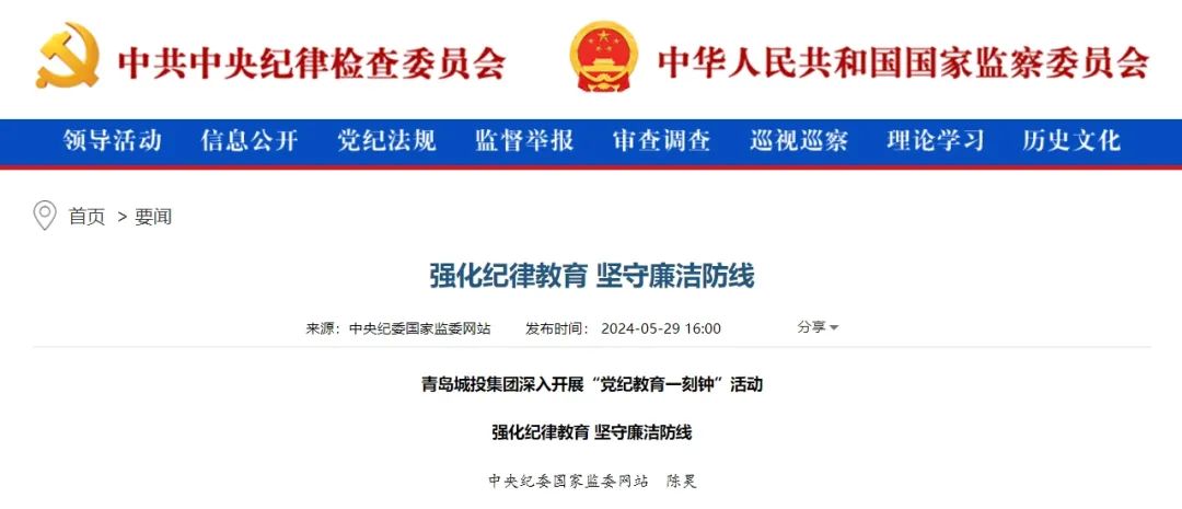 中央纪委国家监委网站:强化纪律教育 坚守廉洁防线 青岛城投集团深入开展“党纪教育一刻钟”活动